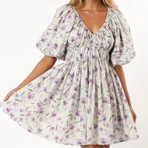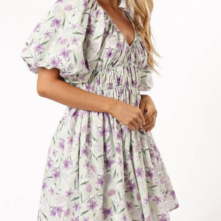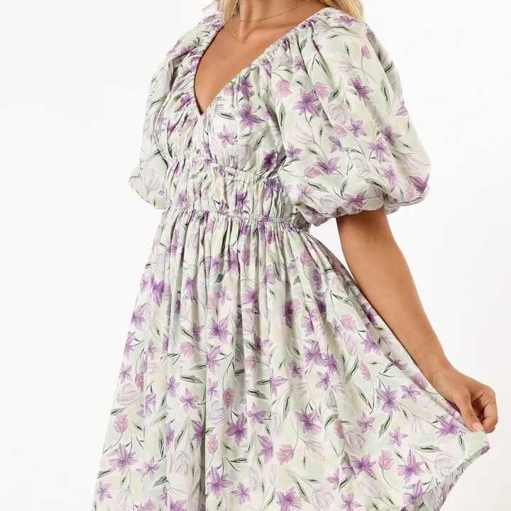 Factory's Summer New Style Floral Skirt Square Neck Bubble Sleeve Tea Break Dress French Retro Natural